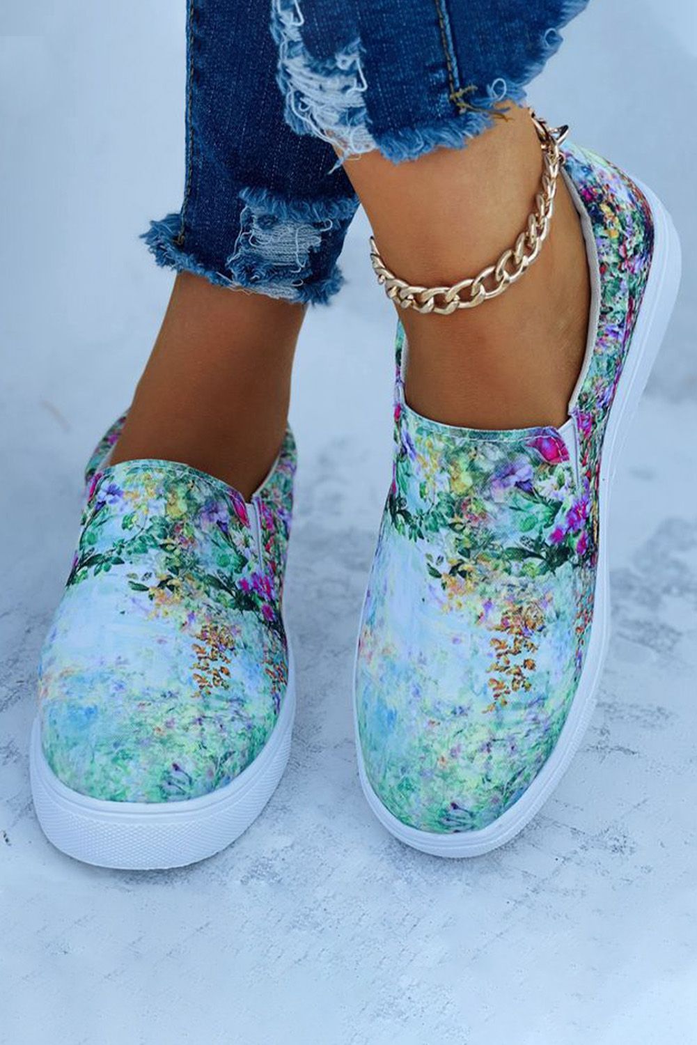 Green Gradient Floral Slip On Canvas Sneakers