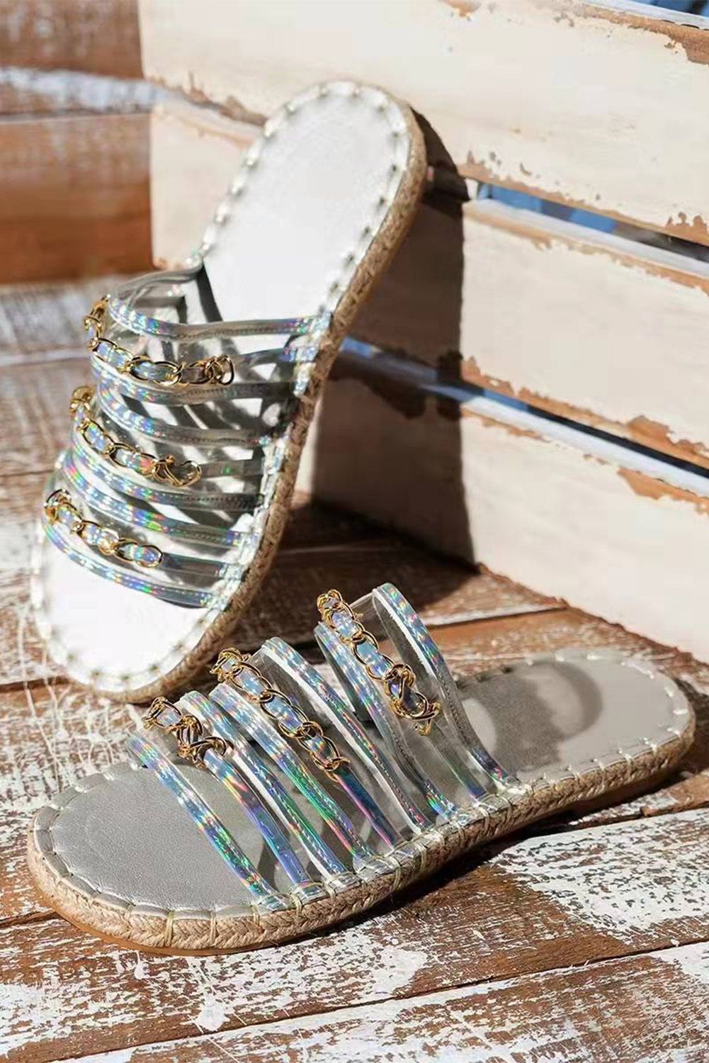 White Open Toe Stiletto Gold Chain Slip On Heeled Slippers