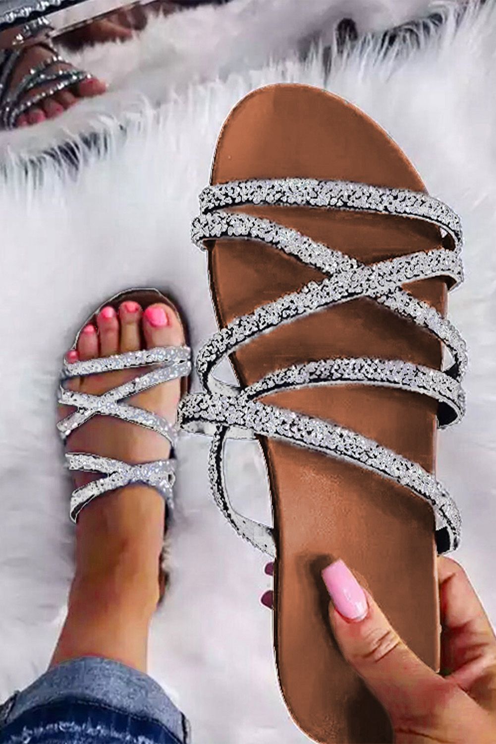 Silvery Round Toe Bling Flat Sandals